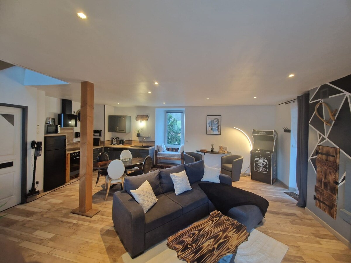 그랑주 데 푸에의 신축 마을 샬레인 그랑지 뒤 에밀 신부를 만나 힐링의 시간을 보내세요. 모든 방과 닫힌 정원, 사우나와 야외 샤워실의 절대적인 파노라마 전망. 자전거와 스키를 위한 안전한 별관. 모든 방에 에어컨이 설치되어 있습니다. 욕실이 딸린 침실 2개. 4인용 넓은 숙소. 어린이용 어드벤처 캠프 베드 (5인용). V.Elec 충전기. 매우 우수한 품질의 서비스.