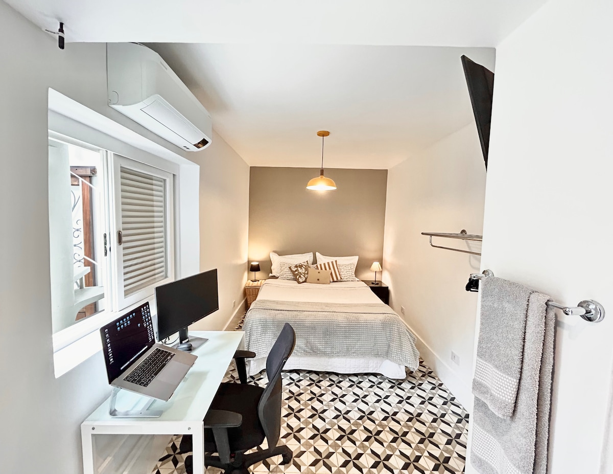 Edรญcula totalmente independente, tranquila c/wi-fi: - Espaรงosa suรญte andar superior c/piso laminado, ar condicionado TV 32" Smart, guarda-roupas, 1 ou 2 camas de solteiro ou 1 de casal, escrivaninha e poltrona. - Banheiro exclusivo c/espaรงoso box e chuveiro eletrรดnico c/regulagem temperatura. - No tรฉrreo, cozinha c/pia, purificar รกgua refrigerada Consul, microondas, frigobar, fogรฃo ร gรกs 2 bocas e forno. - Bairro residencial muito tranquilo e muito arborizado. Comรฉrcio de conveniรชncia a 1km.