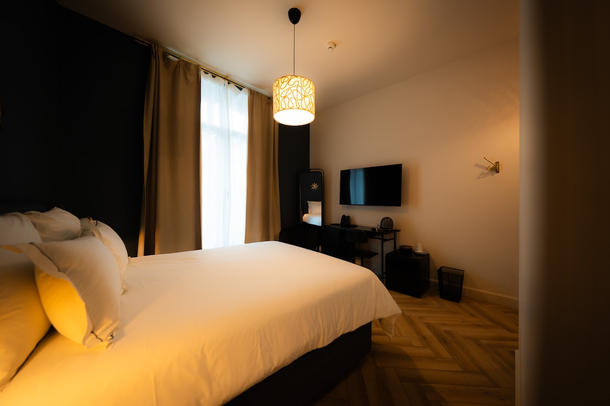유네스코에 등재된 벨프리의 정신에 자리 잡은 이 객실은 도시의 음악적 영혼을 울립니다. 회색 돌이 강조된 벽, 매달린 종처럼 보이는 황금빛 조명 기구 등 모든 것이 몬투아즈의 삶을 유혹하는 카리용의 안정적인 울림을 연상시킵니다. 편안한 킹사이즈 침대, 깔끔한 책상, 워크인 샤워실, 넷플릭스가 있는 스마트 TV. 역사에 조금이라도 민감한 1인 여행객이나 커플에게 이상적입니다.