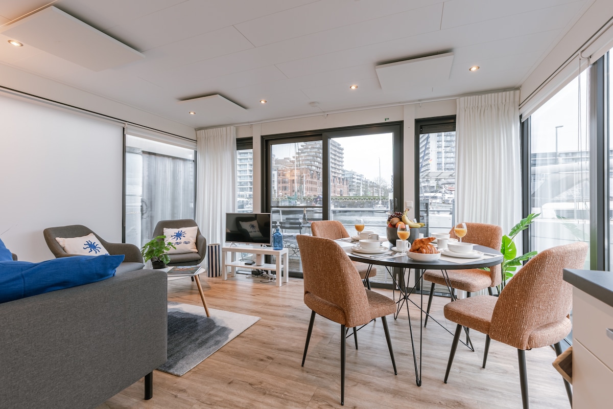 현대적인 디자인의 홈보트 - 독특한 하우스보트 - 물가에서의 편안한 생활 컨셉 - 시골에 위치 - 46평방미터 및 30평방미터의 테라스 - 마리나 웨스트후크 모든 항구 시설 - 니우푸르트 슈타트 센터까지 1km, 브뤼헤까지 40km