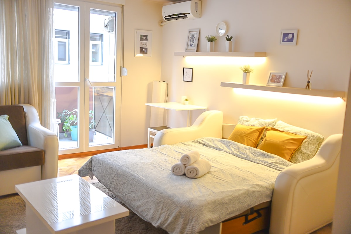 This modern studio apartment is located in the heart of Belgrade, only 2 minutes away from the vibrant Knez Mihajlova pedestrian street. This apartment offers stunning panoramic views of Belgrade and the Sava River, perfect for solo travelers, couples, or small groups of up to 4 people. Whether you're looking for a short-term stay or a longer stay, this apartment is ideal for both, allowing you to make the most of your time in Belgrade and enjoy a truly unique experience.