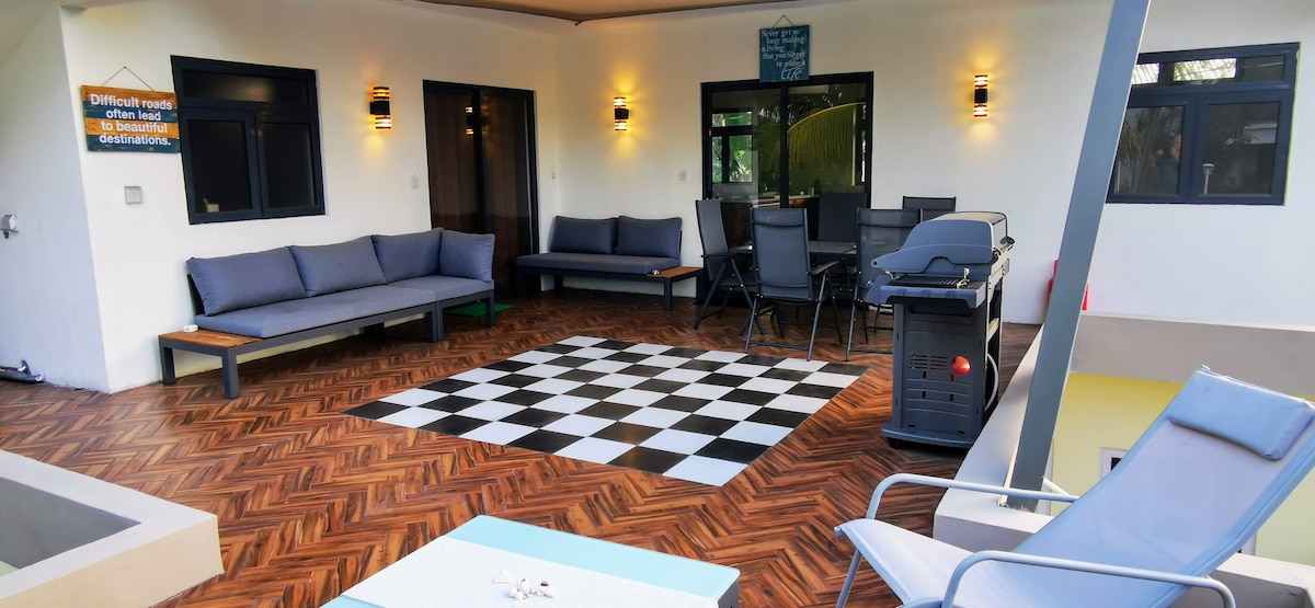 Your 1st floor apartment in a new, small guest house. You will enjoy privacy and 2 Bedrooms, 2 Bathrooms, lounge, 2 kitchens and private patio. The property has heated roof top swimming pool, gym and picnic table. Located close to private beaches and boutique hotels. Your have a large private BBQ terrace, outside seating, and access to bar and others areas. Local restaurants and hotels are a short walk. AC in all rooms. Point aux Canionniers is between Mont Choisy Beach and Grand Baie.