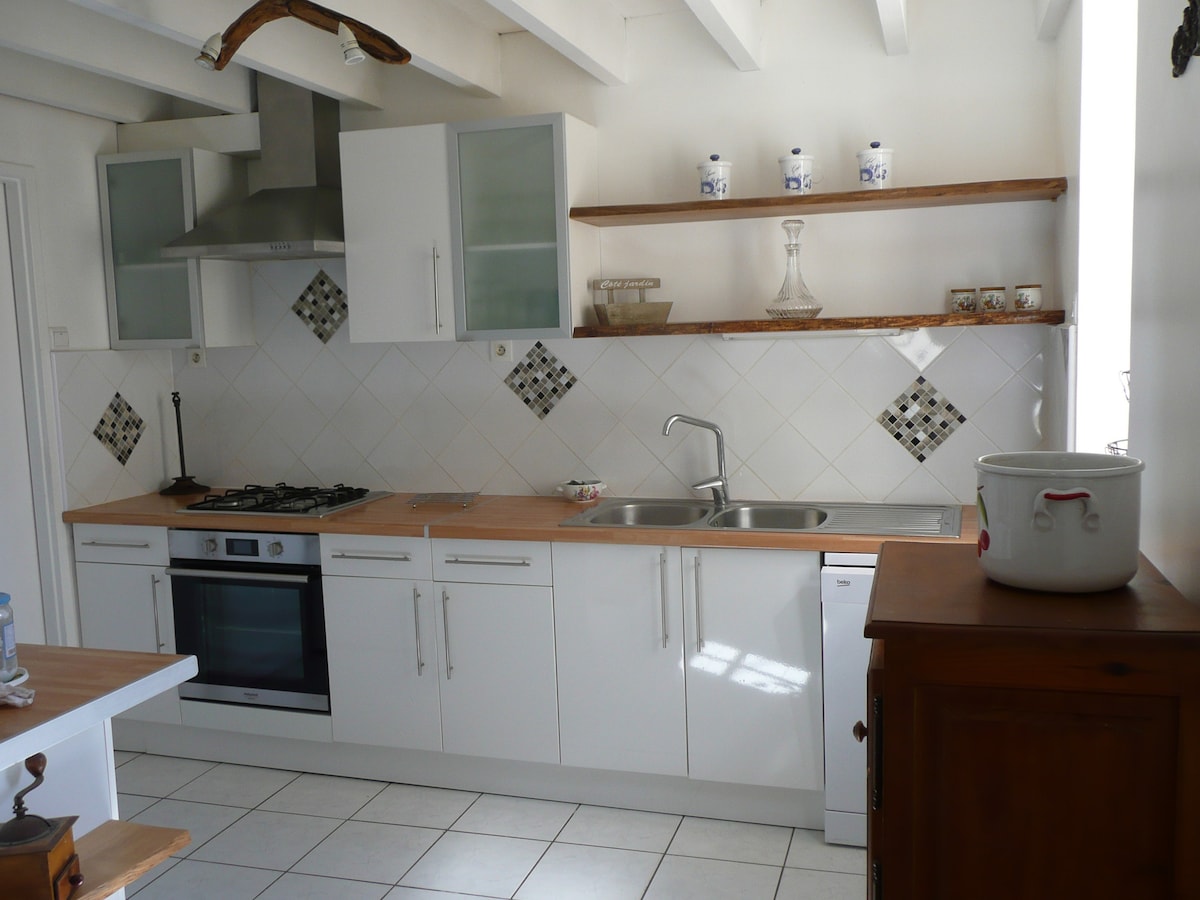 Grange de 250 m2 pour 6 personnes ( Label Entre 2 Mers 4 plumes)) située dans un hameau en surplomb à 18 km de Saint Emilion. Jardin de 3200m2, piscine sécurisée 10/5m, avec volet roulant. Vous serez les seuls "propriétaires" de ce lieu pendant votre séjour. Vous y trouverez, calme, quiétude et grand confort. 3 chambres , 3 salles de bain , 4 WC Plancha, Parking sur place, Babyfoot . Tennis et Boulodrome à 50m. Piste cyclable à 500m. Randonnées balisées dans le village