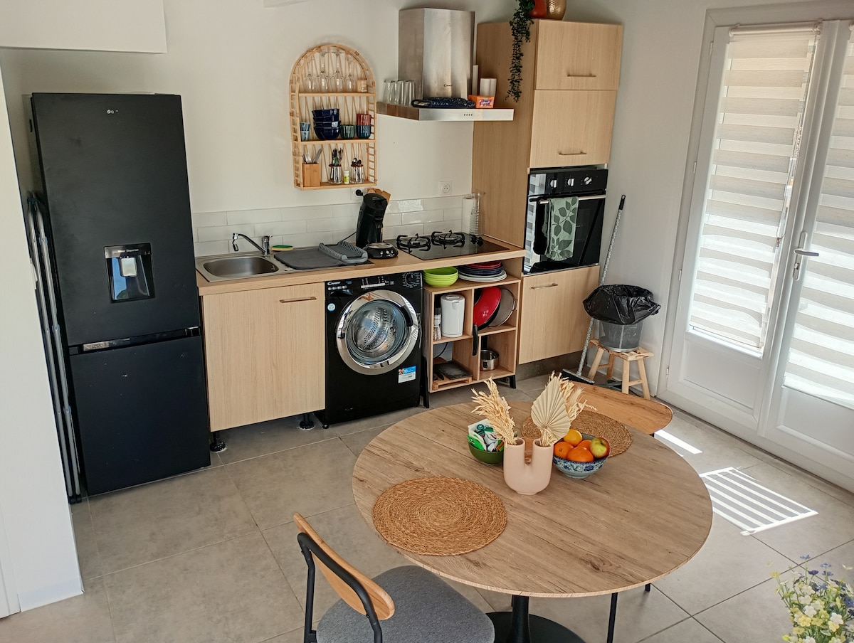Détendez-vous dans ce logement calme et élégant. Studio au rez de chaussée de notre maison. Le logement comprend une salle de bain, des WC séparés, un micro-ondes, une cafetière, un lit 140cm, une bouilloire. Par choix il n'y a pas de cuisine dans le logement mais de nombreux endroits proches vous permettent de prendre des plats à emporter ou vous pouvez réchauffer sur place. Les serviettes et les draps sont fournis. Une télévision est aussi disponible avec Netflix et l'application My Canal.