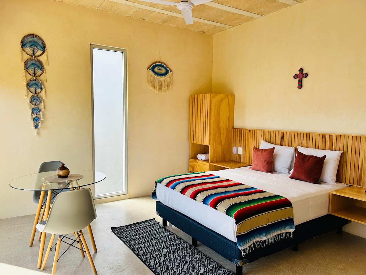 도심 한가운데에 있는 편안한 스튜디오에서 칸쿤을 만나보세요. ADO 버스 터미널과 해변으로 바로 이동할 수 있는 R1 버스에서 100미터 거리에 있습니다. 팔라파스 공원, 마켓 23, 28 등 현지 문화로 둘러싸여 있습니다. 조용하고 안전한 지역으로, 레스토랑, 슈퍼마켓, 상점 등 모든 것이 가까이에 있습니다. 편안함, 위치, 정통성을 추구하는 여행객에게 이상적입니다. 현지 생활에 대해 알아가고 산책을 즐기고 싶다면 이곳은 칸쿤에서 완벽한 숙소입니다!