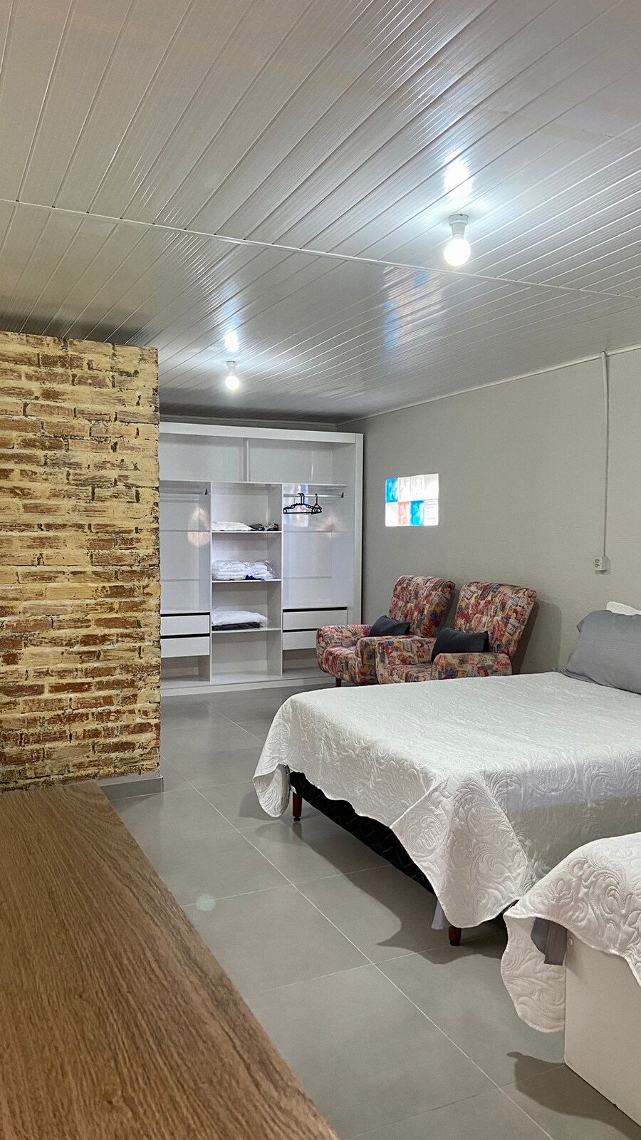 Uma suíte equipada, proporcionando uma estadia aconchegante nos Caminhos de Pedra. Bem ao lado do ponto turístico Cantina Strapazzon onde é realidade o evento Gaita e Assados.Proximo a Casa da Ovelha Possui tv à cabo, wi-fi, cama queen (opçaõ de cama extra de solteiro ou berço), banheiro ,cozinha equipada, microondas, frigobar, jarra elétrica, cafeteira, bule, açúcar, pó para café , Nescafé, leite em pó e chás . Relaxe neste lugar único e tranquilo. Tem um pátio com árvores,lago,super relaxante.