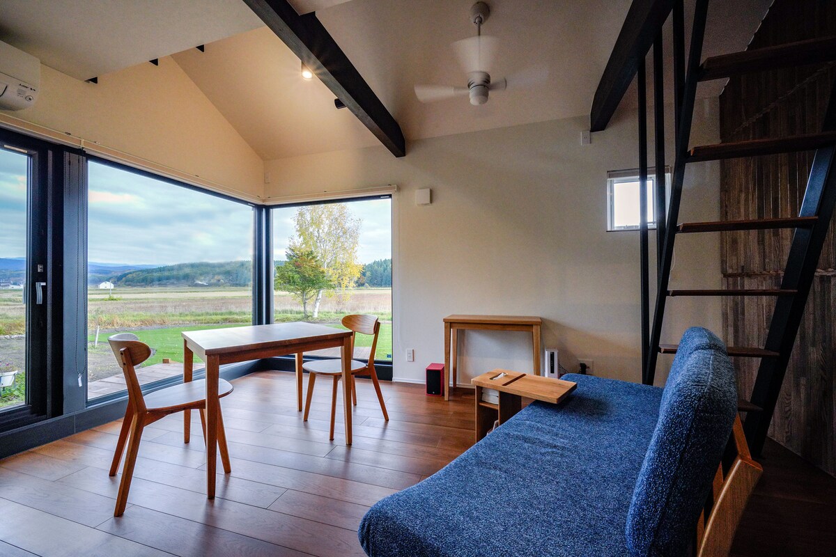 【1】最大2人 × パノラマウインドウから眺める絶景 果てしなく広がる田園、静かな自然に囲まれた環境。清らかな空気と澄み切った空の下で、四季折々の絶景が日常の喧騒から離れ、心身の疲れを癒してくれます。 最大2人まで宿泊可能。大切な人との心の交流の旅、または一人旅にも大人旅に最適です。春には桜のピンクを愛で、夏は蝉の鳴き声に耳を傾け、秋は紅葉に染まる道を散策し、冬は暖かいココアを飲みながらパノラマウインドウから雪化粧したガーデンを眺める。 大自然の中で普段都会では見ることが少ない、様々な虫や動物たちを見ることができるかもしれません! 一人でも二人でも、心の疲れを癒し、特別な体験ができる空間です。 【2】1Kの一棟貸切 × 心温まるデザイン 淡い色調と木材を活かしたインテリア、シーリングファンなどのデザイン性の高い設備。エアコンや暖房完備で、夏も冬も快適に過ごせます。 Airbnbでは珍しい1K戸建て。目覚めた時に広がる田園の美しい景色が、素晴らしい一日の始まりを約束します。 大きな自然を感じながら大人な空間をお楽しみください。