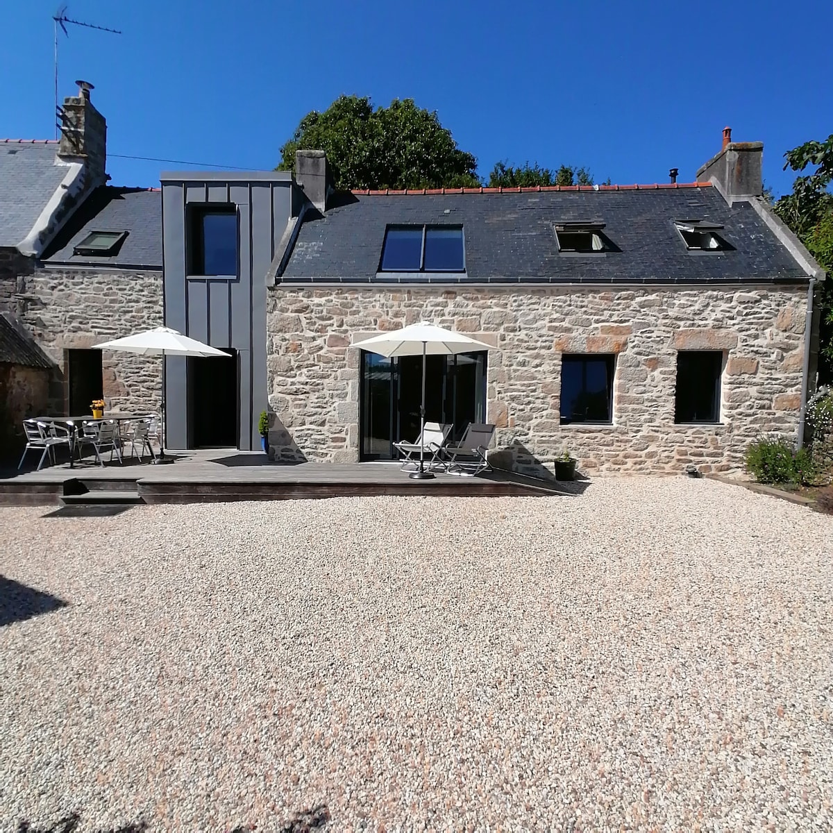 gîte sur deux hectares avec sous-bois. Il s'agit d'un penty, maison au caractère breton en pierres apparentes avec beaucoup d'espace (plus de 80 m2 habitables) Idéale pour les familles avec jeunes enfants car ils peuvent jouer en toute tranquillité et liberté . Le lieu offre un environnement très proche de la nature avec les animaux de la ferme (jeux extérieurs, ballades à poney, rosalie ... ) Pour les locations sur juillet et août uniquement, la durée du séjour est minimum une semaine.