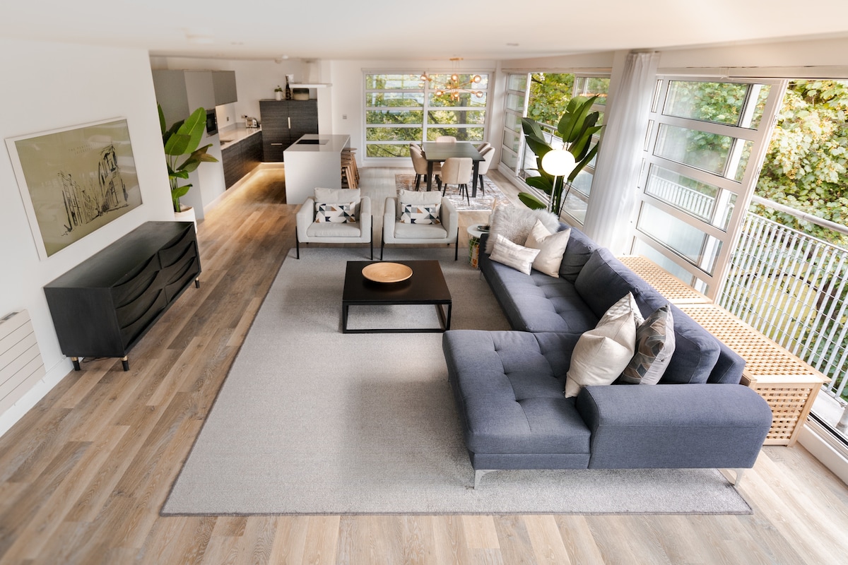 Awarded 'Top 5 National Airbnb Host Awards for Design' and in the 'Top 1% Airbnb' globally in 2024, our 3-bedroom penthouse in Leicester's Cultural Quarter is ideal for families, couples, business travelers, and reunions. Enjoy a sleek, open-plan mid-century style with breathtaking floor-to-ceiling glass walls and a serene treetop ambiance. Just a 5-minute walk from theatres, restaurants, cafes, and entertainment. Book now for an unforgettable stay with stunning views and top-tier amenities.