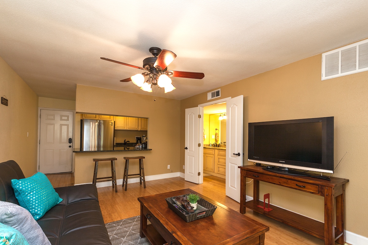 조용하고 낮은 건물에 위치한 넓고 새롭게 리모델링된 콘도로 오스틴 시내의 조용한 지역에 머물러 보세요. 하이라이트에는 *무료 게이트/예약 주차 공간 1개*, *무료 자전거 2개*, 고급 가전제품, 전용 야외 파티오, 킹사이즈 침대가 있는 편안한 침실이 포함됩니다. 콘도에는 4명이 잘 수 있는 퀸 사이즈 침대 겸 소파가 있습니다. 침실과 거실에서 욕실을 이용할 수 있어 침실은 프라이빗하게 유지됩니다. 두 대의 대형 스마트 TV를 스트리밍할 수 있습니다. 머물며, 휴식을 취하고, 즐기세요!