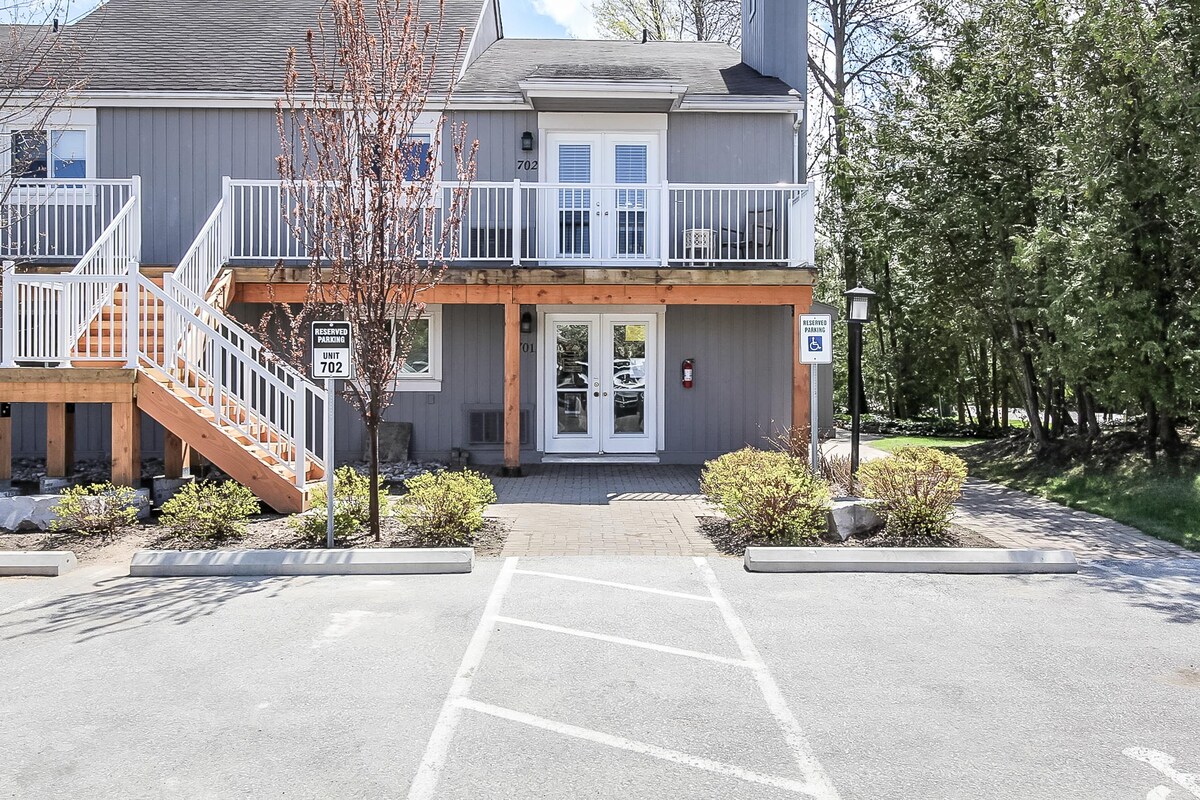 SHUTTLE, HOT TUB, SEASONAL POOL 5-7 minute walk to the Blue Mountain Village. This cozy 2 bedroom condo gives you immediate access to the action or a quiet place to relax by the fireplace while looking out at the mountain views. ★ ★ SMART TVs in living room (WIFI and Cable) and bedrooms (WIFI) ★ Family Ready! Games, booster seat, packnplay etc ★ Resort hot tub with indoor changeroom and washrooms Pool closed for the season