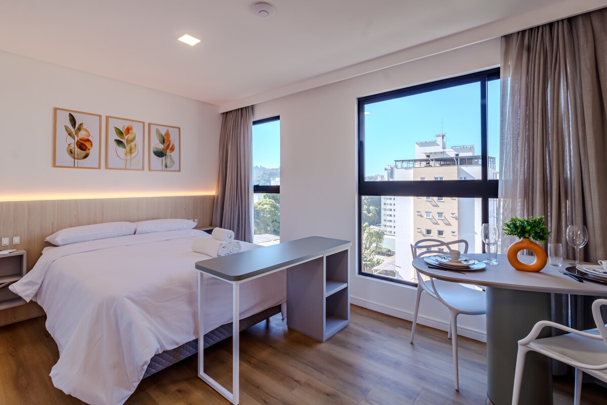 Localização privilegiada no centro de Blumenau, ao lado da FURB, com padarias, restaurantes e mercados. A 5 min da Vila Germânica. Loft completo com cozinha, ar-condicionado, TV e Wi-Fi. Condomínio com piscina rooftop (borda infinita), academia, coworking, pub, área de lazer e mercadinho. ⚡ Carregador para carro elétrico no prédio: uso sujeito a cadastro em horário comercial e disponibilidade; não é exclusivo da unidade.