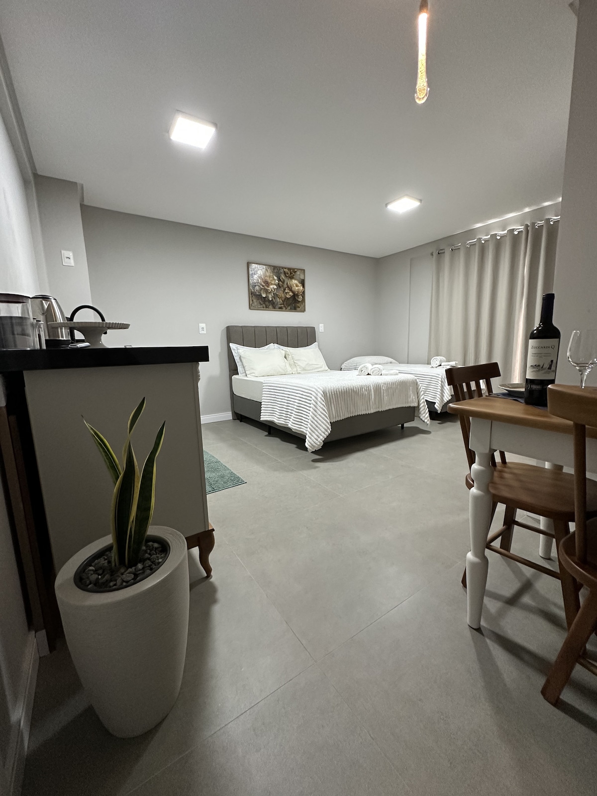 Um espaço confortável e pensado para oferecer uma estadia tranquila. Ideal para casais, viajantes a trabalho ou quem busca alguns dias de descanso. O espaço conta com: Cama confortável 2 colchões extras solteiro Ar condicionado Wi-Fi rápido Smart TV Cozinha equipada Roupa de cama/banho Fechadura com senha Check-In simples e prático Localização: Próximo a mercados, padarias, restaurantes, Vila Germânica (Oktoberfest) e outros serviços essenciais. Ficaremos felizes em recebê-lo!