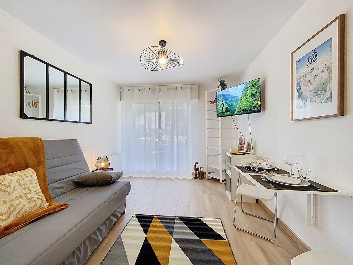 Charming studio in Les Praz, facing south, with private garden & terrace and breathtaking views of the entire Mont Blanc mountains. Ideally located, halfway between downtown Chamonix and the cute village of Les Praz. Far away from the noise, but at walking distance of it :-) Just renovated, combining wood and modernity, this studio of 22 sq.m can accommodate up to 4 people (1 brand new (Sept. 18) sofa bed 140cm & 2 retractable bunk beds).