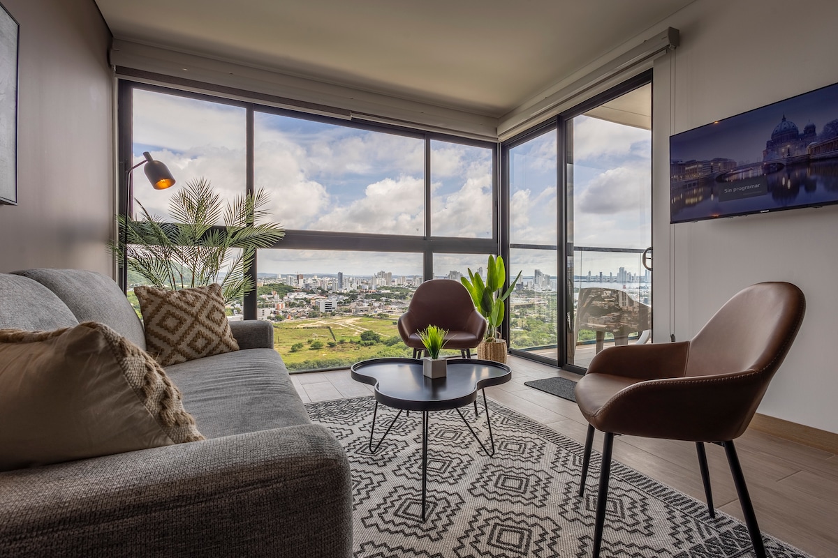 카르타헤나 역사 센터와 카리브해가 내려다보이는 신축 아파트로 6명에게 안성맞춤입니다. 침실 2개, 욕실 2.5개, 완비된 주방, 에어컨, 광섬유 인터넷, 스마트 TV를 갖추고 있습니다. 역사 센터에서 단 2분 거리에 있습니다. 이 건물에는 인피니티 풀, 자쿠지, 헬스장, 코워킹, 소셜 라운지, 연중무휴 리셉션이 있습니다. 5년 경력의 슈퍼호스트로서 편안하고 안심할 수 있는 숙박을 보장합니다. 단기 또는 장기 숙박에 이상적입니다.