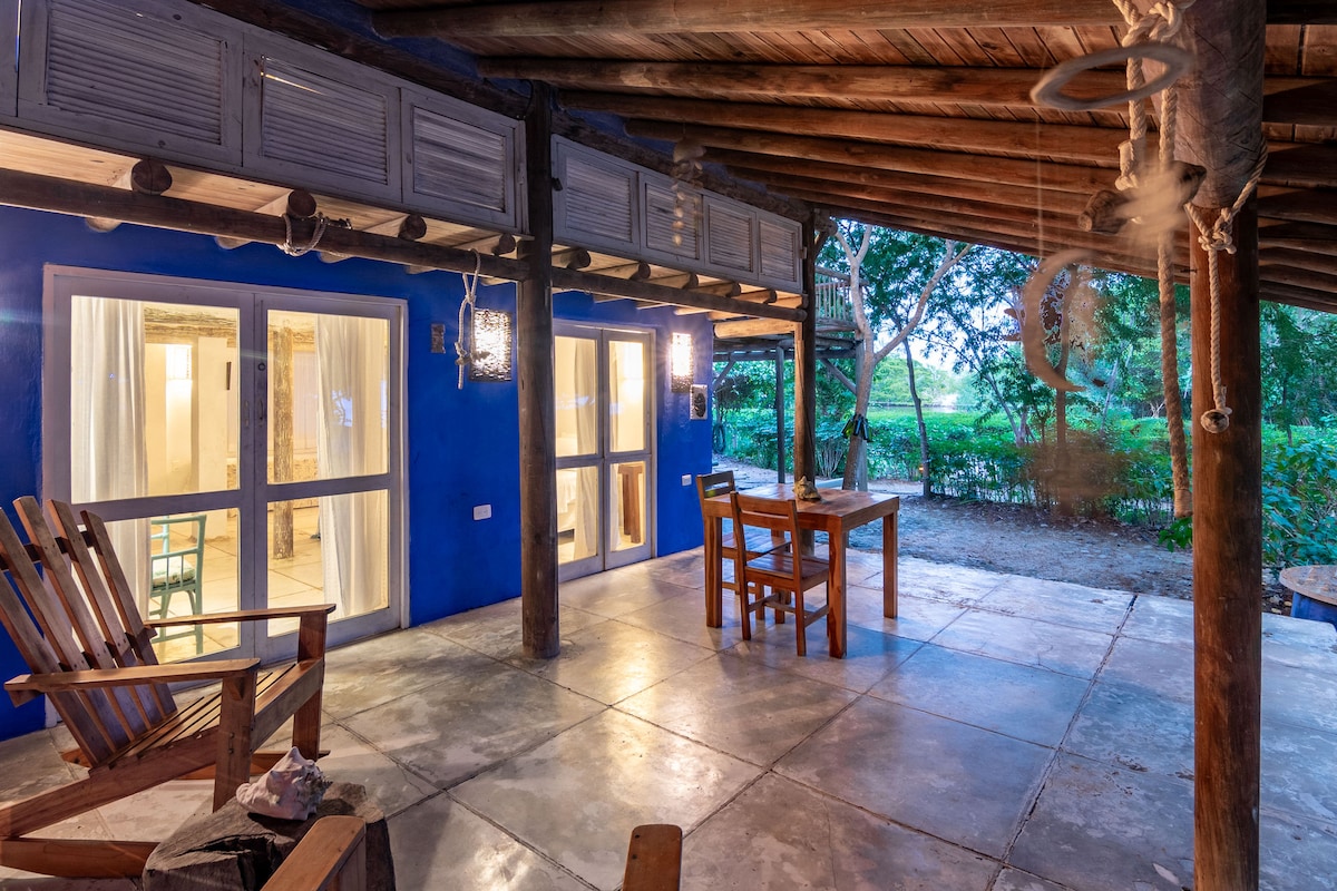 La habitación Pulpo tiene 1 cama doble queen, para albergar hasta 2 personas. La Coralina azul, es un hotel ubicado en un ambiente natural a 5 minutos caminado del mar, cuenta con 2 cocinas compartidas, 2 zonas de comedor, zonas interior y exterior de hamacas. Para los niños hay una zona con arenero y columpios. Es un sitio maravilloso. El mar y la naturaleza te invitan a ser feliz allí los pajaros y los monos te saludan en la madrugada. Relájate en esta escapada única y tranquila.