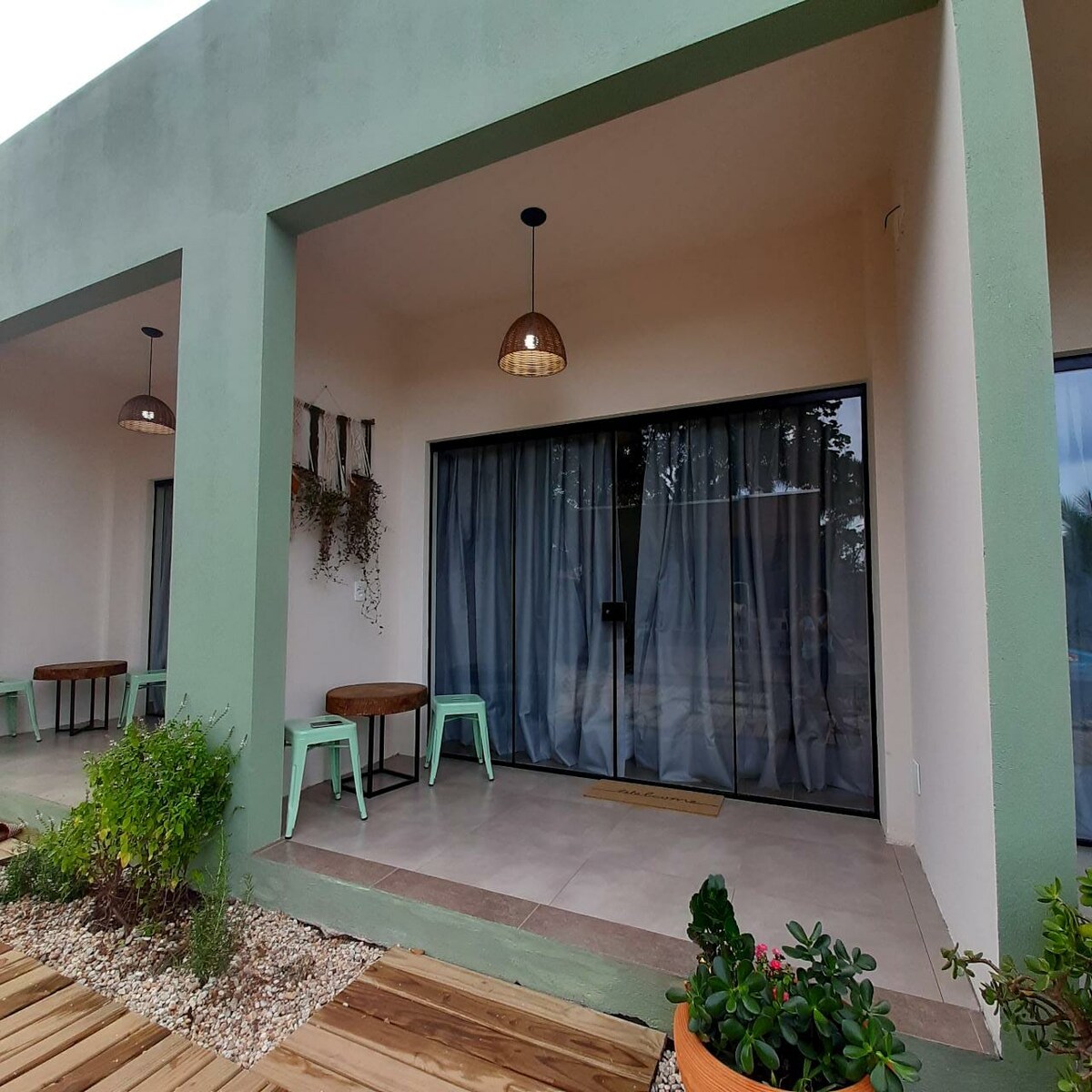 자쿠지가 있는 방갈로, 새롭게 리모델링(2024), 에어컨이 있는 전용 욕실, 2인용, 반려동물 동반에 이상적; 주방(스토브, 전자레인지, 믹서기, 바비큐, 커피 메이커 및 식기)이 있는 공간으로, 소파가 있는 거실 공간은 없습니다!!자쿠지 주변의 데크와 나무 정원이 있는 차고로 둘러싸여 있습니다. 마리스칼 해변에서 약 900m 거리에 있는 열대우림의 멋진 전망을 자랑하는 카사.