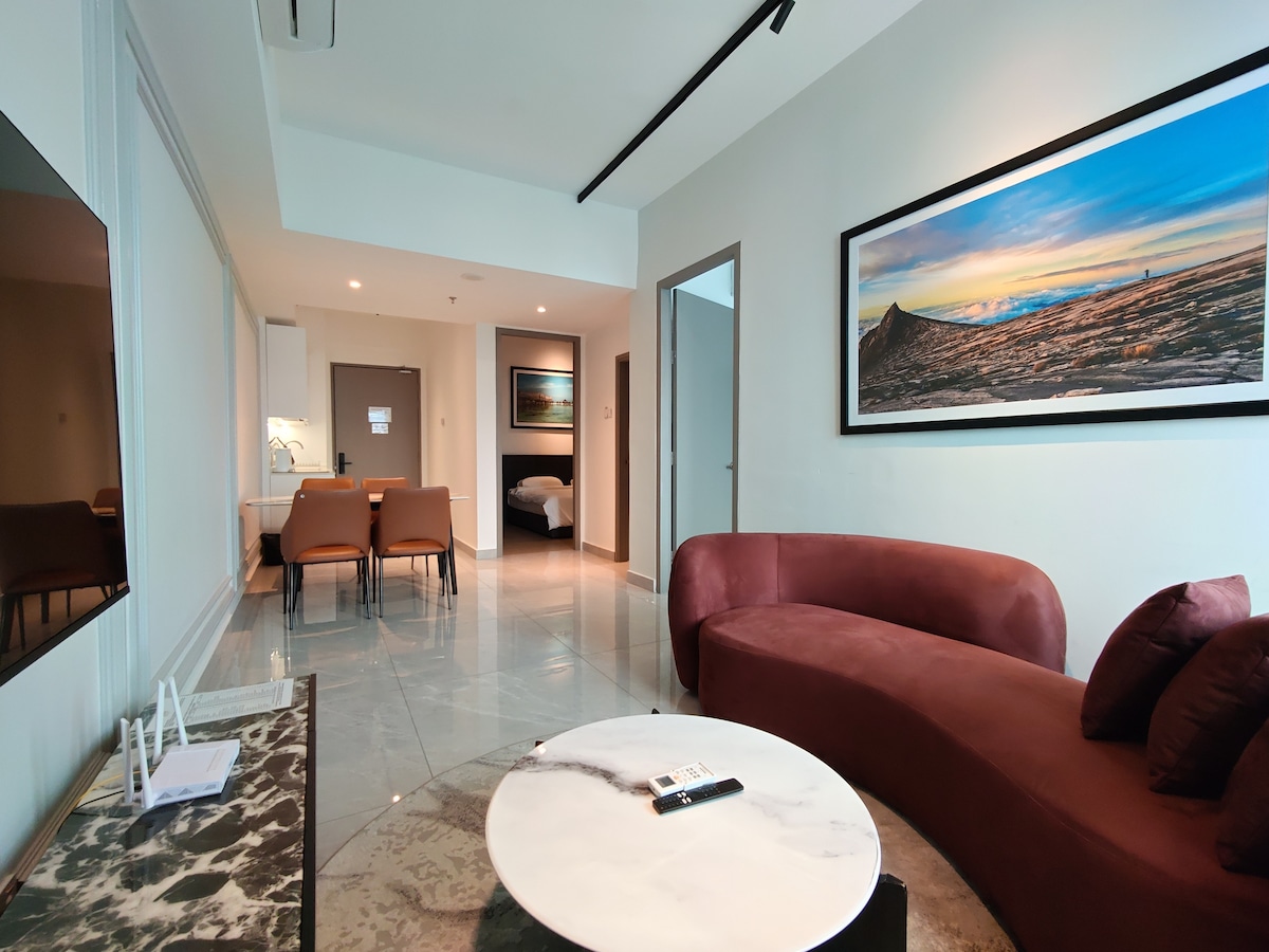 💡 For safety reasons, iron is not provided, but a garment steamer is available upon request 🔹 13th floor with sea & Mt. Kinabalu views 🛏️ 2BR suite with king beds 🌅 Balcony to enjoy sunrise & breeze 📺 55" Xiaomi TV + fast Wi-Fi 🛋️ Living area with sofa, rug, coffee table 🍳 Kitchenette with stove & cookware 🍽️ Dining table for 6 🚿 Japanese-style bathroom (shower only) 🔋 Bluetooth nightstands w/ wireless charging