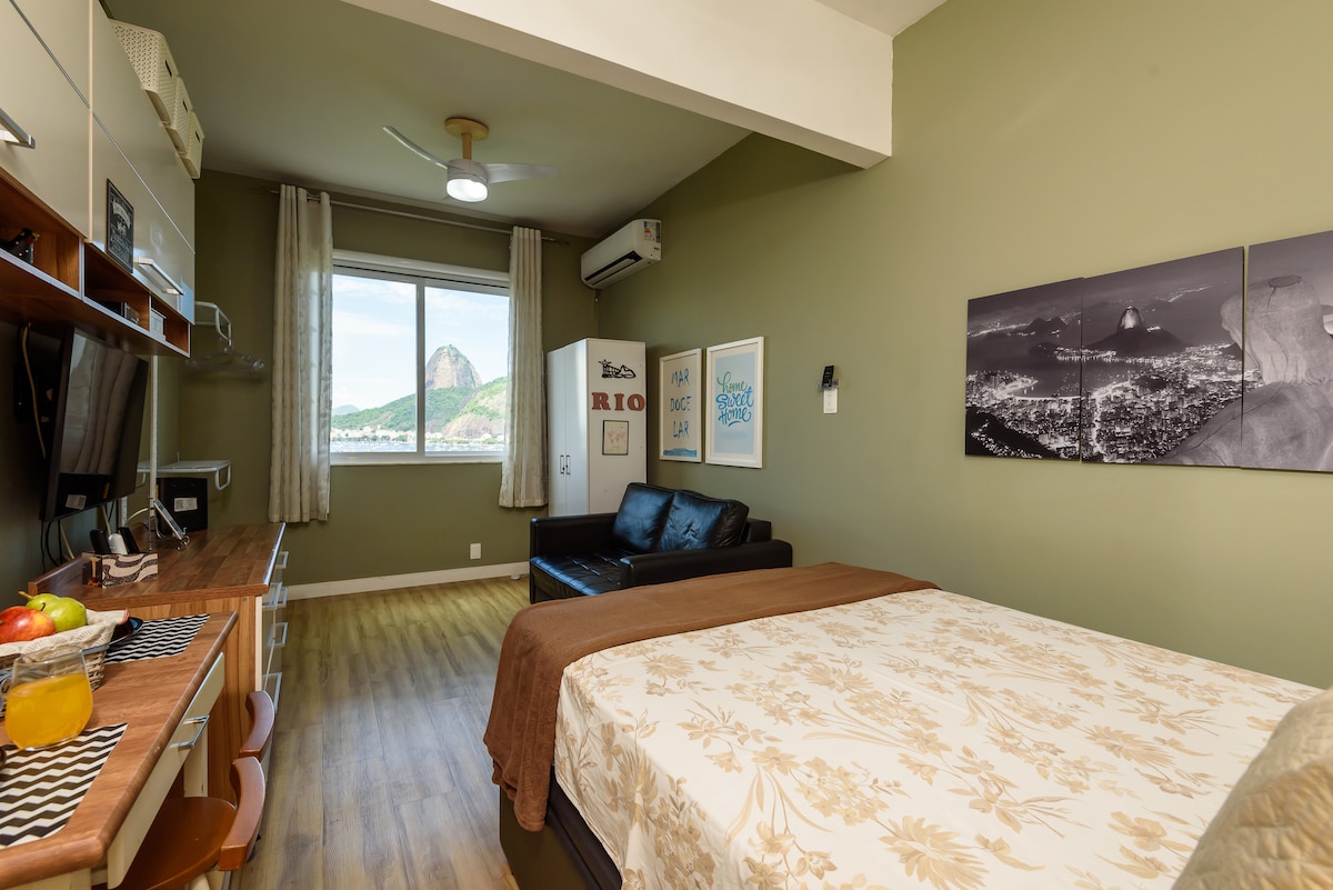 퀸사이즈 더블 베드가 있는 깔끔한 스튜디오. 에어비앤비는 구아나바라 베이와 슈거로프의 숨 막히는 정면 전망을 자랑합니다. 리우데자네이루에서 가장 멋진 전망을 감상하며 일출을 즐겨보세요. 홈 오피스용 책상, 창문형 에어컨, 스마트 TV, 냉동고가 있습니다. 2개의 링 가스레인지와 아파트에는 거실과 침실에 정수 필터와 천장 선풍기가 있습니다. 따뜻한 샤워. 지하철역에서 도보로 5분 거리.