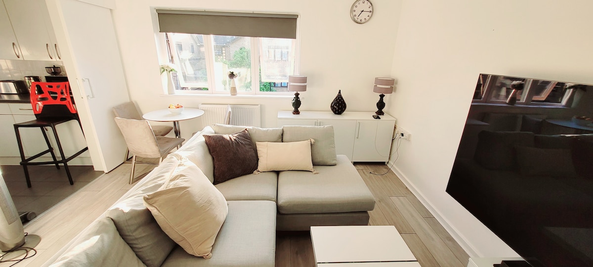 ์คํ์ผ์ด ๋๋ณด์ด๋ ์์์์ ํธ์ํ ํด์์ ์ฆ๊ธฐ์ธ์. ๋ฐ๋ ์ด์คํธ ์๋์ ์์นํ ํ์ ๋ธ๋ก์ ์๋ ์ต๊ทผ ๋ฆฌ๋ชจ๋ธ๋งํ ์นจ๋ 2๊ฐ์ ์์๋ก, ์นด๋๋ฆฌ ์ํ๊น์ง ๋๋ณด๋ก 15๋ถ, ๋์๊น์ง DLR์ ํตํด 15๋ถ ๊ฑฐ๋ฆฌ์ ์์ต๋๋ค. - ์นจ์ค 2๊ฐ: ๋๋ธ๋ฃธ 1๊ฐ ๋ฐ ์ฑ๊ธ๋ฃธ 1๊ฐ - ์ด์ ๊ฑฐ์ค์ ์ํ ๋ฒ ๋๊ฐ ์์ต๋๋ค. - ์ง์ฒ๋ผ ํธ์ํ๊ฒ ์ง๋ด๋ ๋ฐ ํ์ํ ๋ชจ๋ ๊ฒ์ ๊ฐ์ถ ๊ฐ๋ฐฉํ ์ฃผ๋ฐฉ๊ณผ ์์ฌ ๊ณต๊ฐ. - ์ธ๋ จ๋ ์์ค - ์๋ฆฌ๋ฒ ์ดํฐ๊ฐ ์๋ ์ต์์ธต 8์ธต. - ๋์ชฝ, ํฐ ๊ณต์์ ๋ง์ฃผํ๊ณ ์์ต๋๋ค. ๊ณต์์ด ๋ด๋ ค๋ค๋ณด์ด๋ ๋ฐ์ฝ๋.