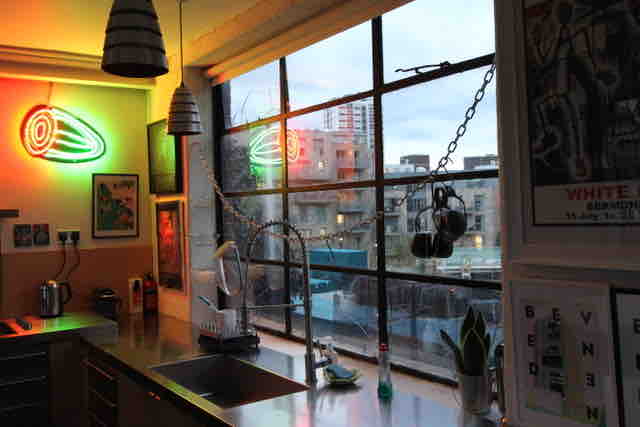 Windows to three sides. Uk second floor walk up, accessed from an external staircase. Boffi stainless steel kitchen. Superking (180cm wide) Tempur bed. Luxury 90cm wide, extra deep bath and shower. Up to 80 meg wifi. The building also houses a permanent family home, so a pile in from a bar at closing or after a party is not possible.