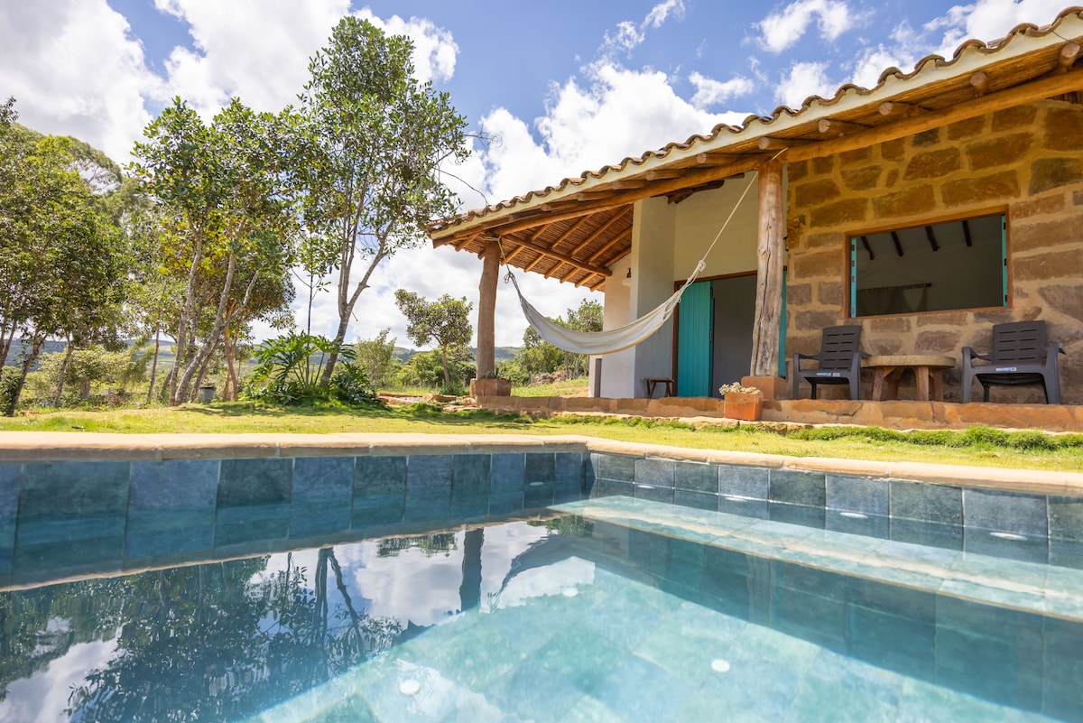 Buratá Haus son cabañas con arquitectura colonial ubicadas a 3.5 kms de Barichara, ofrecemos un espacio en la naturaleza para desconectarte. Encontrarás una cama king size, ducha caliente a cielo abierto y un hermoso jacuzzi a temperatura ambiente en uno de los mejores climas del país. También puedes hacer uso de una cocineta al aire libre, cuenta con minibar y elementos básicos para preparar tus alimentos favoritos . El servicio de desayuno está incluido en el precio de la reserva.