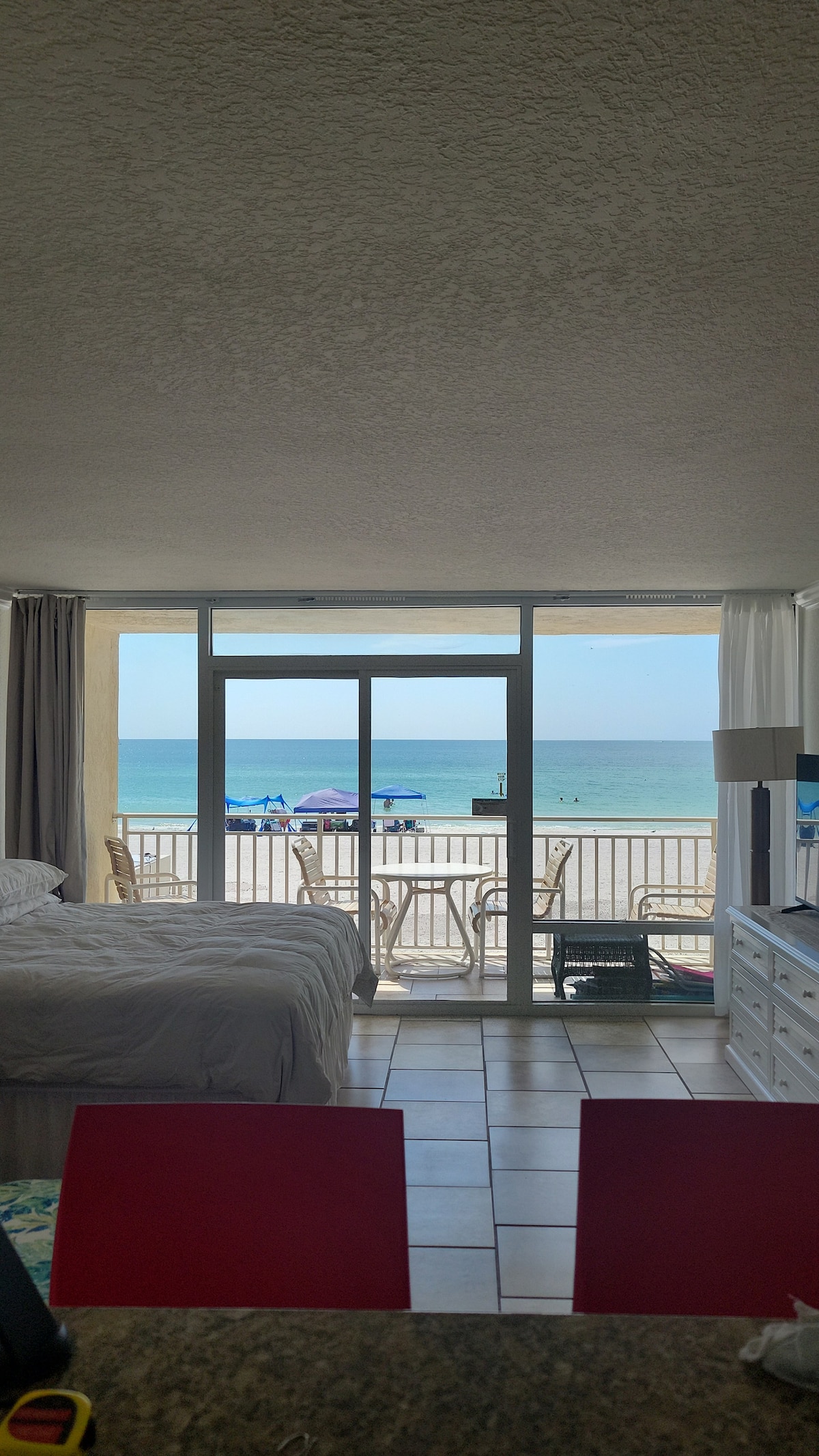 This is a recently renovated honeymoon suite located directly across from the big end of Siesta Key. It is an elegant ground floor pool unit. This unit is equip with marble countertops, tigers eye, lapis lazuli tables, bladeless ceiling fan, alabaster lighting and giant TVs. All of the appliances are stainless/smart and the microwave can cook steaks. There is a gym. The geographic location on the key can not be beat! There is a floating television over the California King luxury memory foam bed.