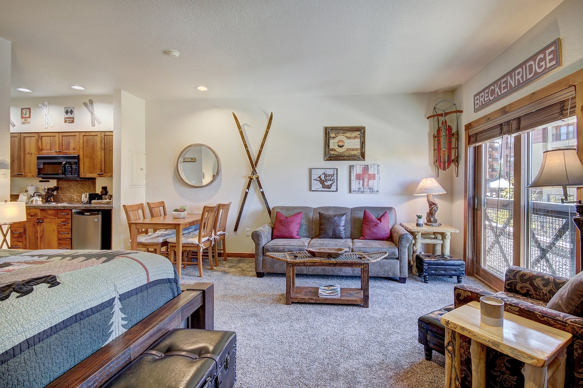 ★위치: 피크까지 1/2마일 8. 브레켄리지 시내까지 1마일로 쇼핑과 식사를 즐길 수 있습니다. 2인 ★무료주차 무료주차 ★새롭고 편안한 침대 거실과 침실의★ 로쿠 TV, G00gle 홈, 케이블 TV, 케이블 TV, 고속 와이파이 ★새롭게 단장한 욕실: 제트 욕조 + 레인폴 샤워 헤드 시설이 ★완비된 새로운 주방: 듀얼 커피 메이커, 냄비, 프라이팬, 식기, 토스터, 믹서기, 믹서기, 와플 메이커, 와플 메이커 등! 산 경관을 감상할 수 있는★ 발코니 ★가족 친화적: 팩앤플레이, 유아용 의자, 장난감, 보드게임, 식기