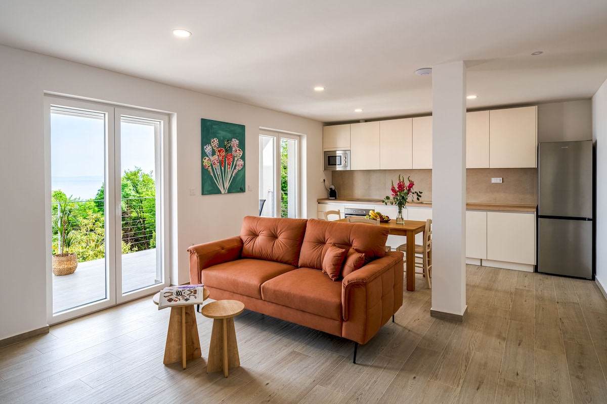 Our 4 star apartment is located near Opatija in an old house on a peaceful location. It has one bedroom, living room, kitchen and bathroom. In addition to the parking lot there is a terrace with stunning views of the Adriatic Sea.