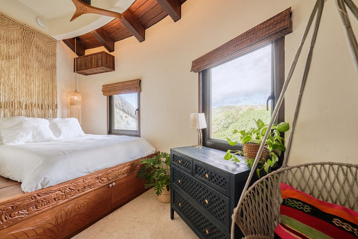Experience the Blessing of Joy. Nestled within the main house, this queen‑sized retreat offers a refined sanctuary infused with the spirit of happiness, and overlooking lush island gardens and Higher Love Mountain. Between saltwater pool dips, indulgent spa rituals, and sunset beach strolls, every detail nurtures body, soul, and inspiration.