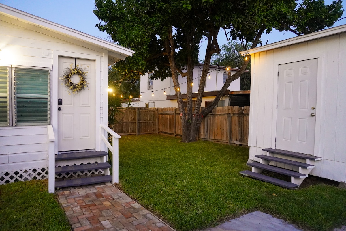 Welcome! This tiny home in the historic district is close to parks, eateries, museums, shops, the farmers market, and the Gladys Porter Zoo. Explore downtown, venture into Mexico, visit the Island, SpaceX, or simply unwind at home. Inside, find a living area and kitchen, a bedroom with a queen bed, TV, and reading corner. Step onto the back porch for views of the lit patio and private fenced yard. Book your stay now! Can't wait to have you over!