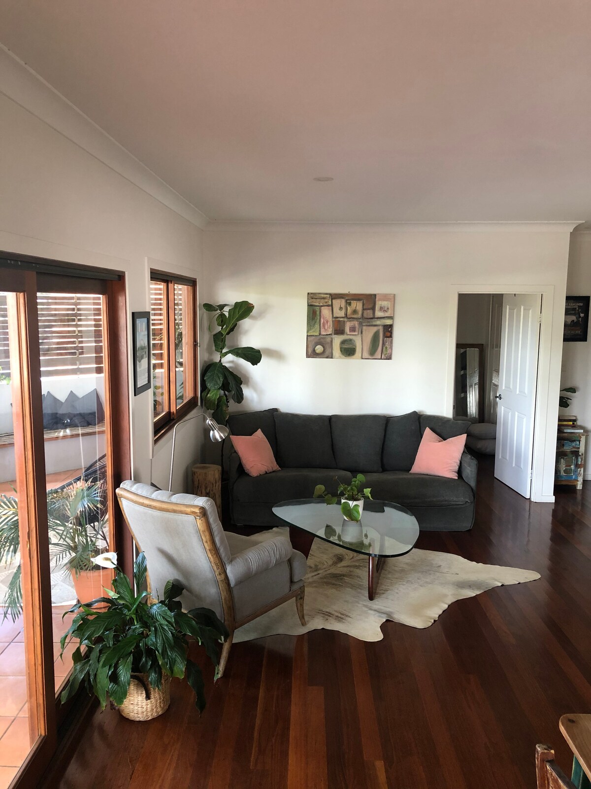 Spacious, private and comfortable top floor apartment with exclusive entrance through own enclosed Franjipani gardens. Generous light-filled living areas and breezy balconies. Extra large master and queen bedrooms with treetop views. Quiet location opposite nature reserve. Outdoor bbq/ daybed/ dining/ firepit in beautiful secret garden. 2 minute walk to river in Bruns. Walk to beach, cafes, restaurants, bars, pub, shops, markets and enjoy the simple pleasures of our special riverside village