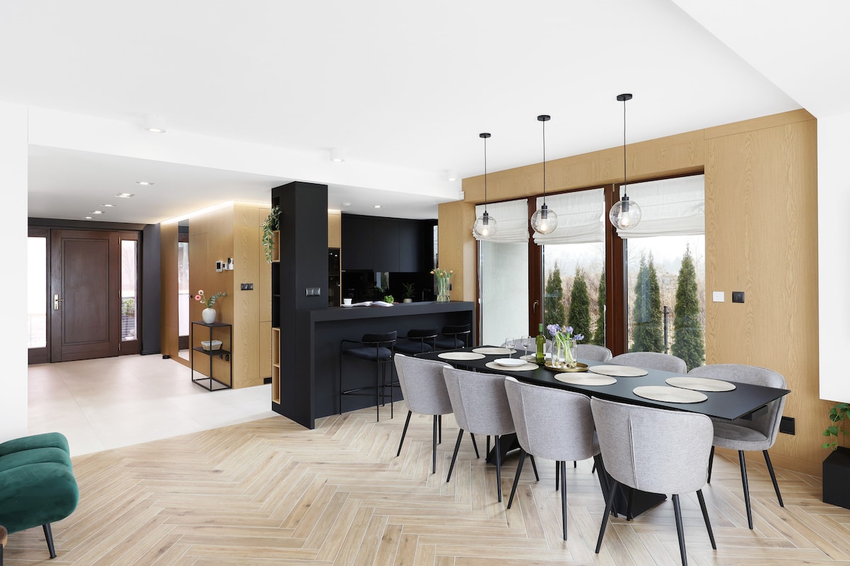 Spacious and cosy house with five separate bedrooms located in the rural suburbs of Cracow. Big living room with fully equipped kitchen, a big table for 10, two modern bathrooms and a large terrace leading to the garden at the Guestโs disposal. The rooms are equipped with comfortable double or single beds and big wardrobes. In the living room there is also a flat screen TV and a fireplace that will make the evenings spent on the sofa a truly relaxing experience.