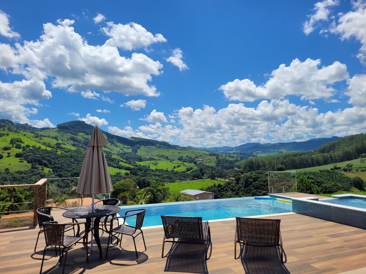 Refúgio romântico em meio à natureza, ideal para casais. Chalé estilo suíço (A-frame) em sítio cercado por cafezais, com rio e cachoeira particulares. Possui banheiras externas com vista para a Serra da Mantiqueira, jacuzzi interna, fogueira, churrasqueira, quadra de beach tênis, cama-balanço, sauna seca com vista e projetor interno com telão de 100”.