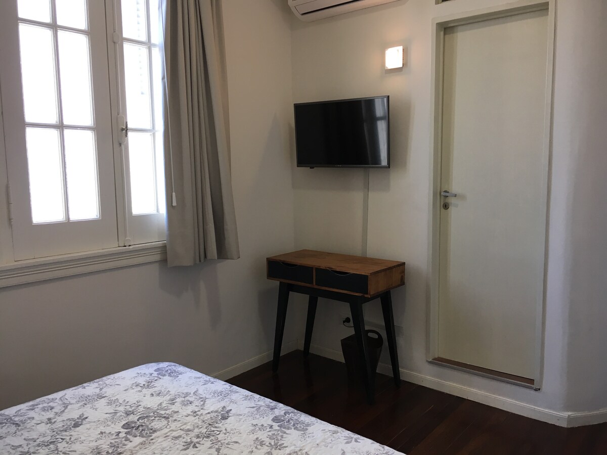Es una casa de familia en pleno barrio de Palermo Soho. Tenemos una gata y una perra muy amigables. Somos gay friendly. No aceptamos niños menores de 12 años. El cuarto tiene 28 mt2, dispone de cama doble y un cómodo sillón, posee SMART TV con servicio por cable y wifi free. El baño es de uso exclusivo y de grandes dimensiones, tiene 15 mt2, espacio compartimentado de inodoro y bidet, tiene gabinete de ducha y una bañadera antigua.