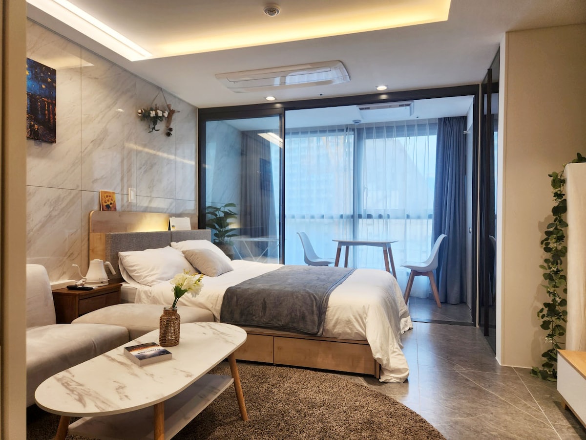 2023년 오픈 냉장고, 세탁기, 주방, 옷장, 에어컨이 풀옵션으로 갖춰진 레지던스 입니다. - 언택트 체크인 숙소 [침실] - 퀸 사이즈 베드 1개 [주방] - 간편한 취사가 가능한 각종 조리도구 - 냉장고, 전자레인지, 커피포트 - 세탁기, 세탁세제 *조미료는 구비되어 있지 않습니다. [욕실] - 샴푸, 컨디셔너, 바디워시 - 헤어드라이기, 수건 - 객실에 구비된 비데 * 1회용 욕실용품(칫솔, 치약, 폼클렌징 등) 제공은 불가합니다. * 55" Smart TV 넷플릭스(개인계정)/유튜브 시청 가능합니다. * 건물내 유료 주차 가능 합니다.