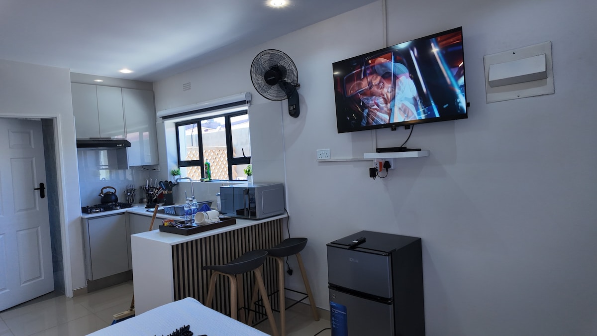 편안함, 프라이버시, 차분한 에너지를 제공하는 세련되고 독립적인 스튜디오입니다. 마음에 드실 만한 점: 🛏️ 욕실이 딸린 개방형 스튜디오 – 심플하고 모던하며 편안한 분위기 🍽️ 간이 주방 – 스토브, 미니 냉장고, 전자레인지, 필수품 구비 🌿 전용 파티오 입구 – 나만의 공간에서 야외에서 휴식을 취하세요 ⚡ 태양열 발전 및 물 공급 백업 📶 초고속 와이파이 - 스타링크 📺 DSTV 액세스가 가능한 스마트 TV – 라이브 스포츠 및 엔터테인먼트 🚗 안전한 주차 공간 🌞 안전하고 조용한 위치