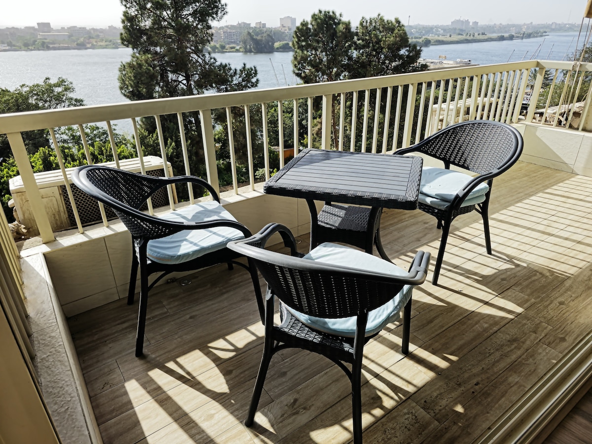 Modern Appartment front nile river 2-bedroom apartment next to the Holiday Inn. Enjoy a direct Nile view from a private balcony. Fully air‑conditioned, with oil heaters, two bathrooms, and a fully equipped kitchen. The living room features a 65-inch Smart TV with Netflix, Amazon Prime, live sports, and international channels. Fresh towels and bed linens provided for a comfortable stay.