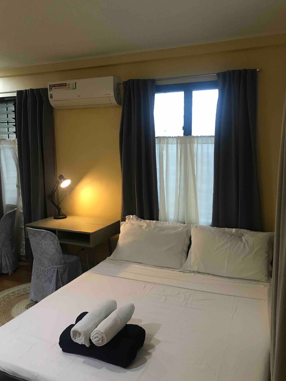 스튜디오 유닛 숙소 면적: 37 필요한 경우 주차 공간을 마련해 드릴 수 있습니다. - 보니파시오 글로벌 시티 내 - 인근의 주요 시설 - 싱글 침대 2개 - 결합 가능 - 침대 결합 - 2개의 싱글 침대를 연결하기 위해 맞춤형 폼을 제공합니다. - 시트 및 세면도구 제공 - 43인치 스마트TV - 와이파이 및 넷플릭스 - 주방용품 및 전자레인지 - 옷을 위한 다리미/헤어드라이어 - 히터