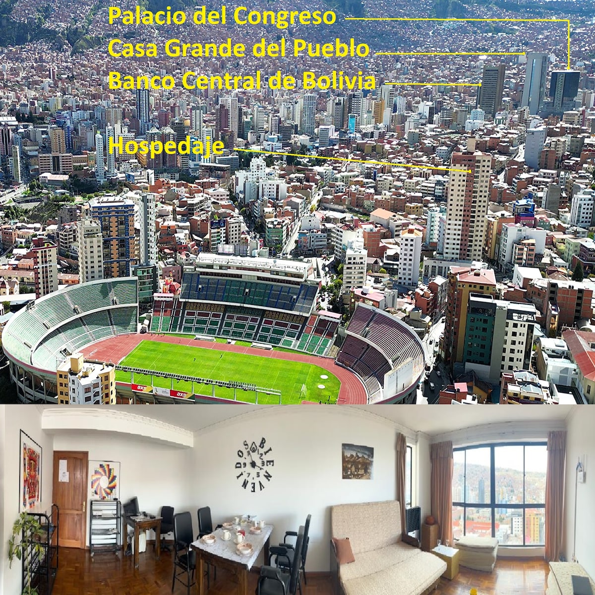 라파스 🏙️ 한복판에 있는 파노라마 아파트에서 독특한 경험을 즐기세요. 레스토랑, 카페, 관광지, 광장, 펍, 슈퍼마켓 등이 주변에 있습니다. 18층에 위치해 있어 라파스의 아름다움을 놓치지 않을 것입니다. 이 아파트는 집처럼 느끼실 수 있도록 필요한 모든 시설을 갖추고 있습니다🏠. 문 앞에서 도시의 모든 지점으로 이동할 수 있는 교통편을 찾을 수 있습니다🚌. 건물에는 24시간 보안 및 감시가 있어 안심하고 이용하실 수 있습니다.