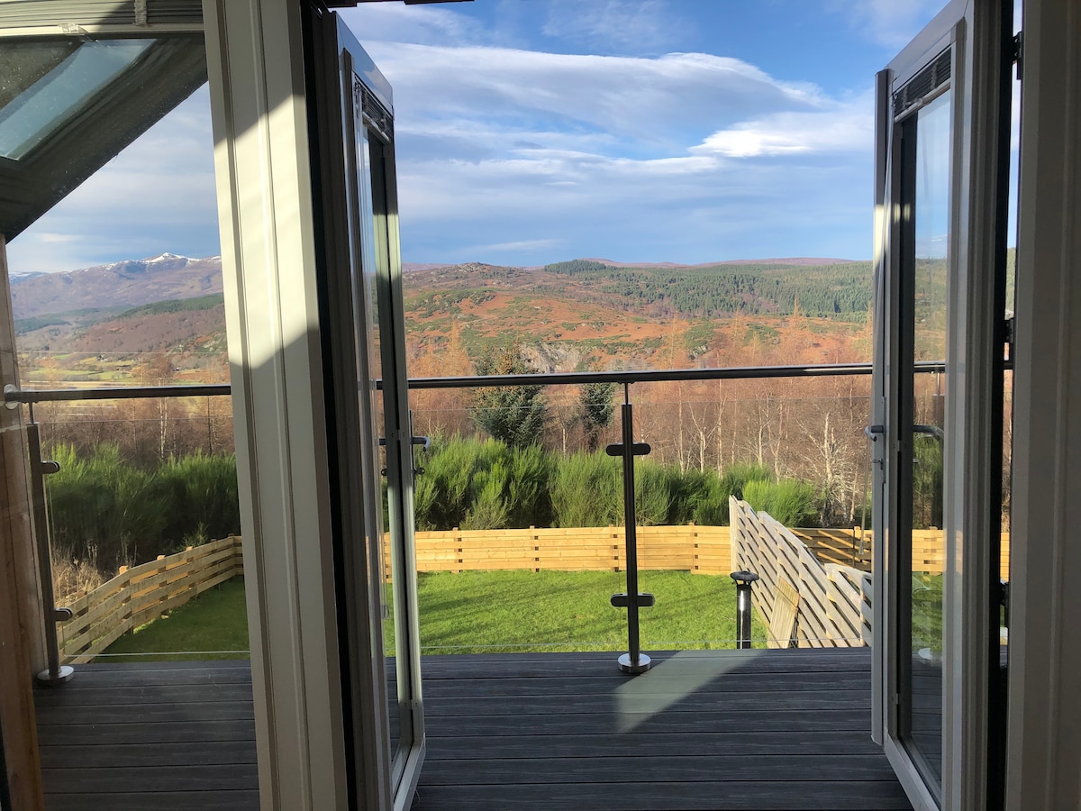 Thistledown is a one bedroom spacious and modern holiday home for 2 set in the beautiful rural location of Strathnairn. Surrounded by countryside it has stunning views of the Monadhliath Mountains but just a 15 minute car ride from the city of Inverness, perfect for a peaceful break. Ground floor large open plan kitchen/ sitting area, under floor heating ,wood burning stove. First floor spacious bedroom with king size bed,Juliette balcony. Large modern Shower room. Great WiFi private parking