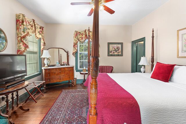 이 사랑스러운 방의 매력에 빠져보세요. 여관의 뒤쪽 지역이 내려다보이는 커다란 코너 게스트룸은 한적하고 낭만적인 은신처입니다. 게스트 룸은 풍부한 보석 색조로 강조되어 있으며 아름다운 일출 전망을 자랑합니다. 킹사이즈 포스터 침대 4개, 우아한 영국식 옷장, 사랑스러운 앤티크 서랍장, 편안한 독서 의자가 있어 평온함을 느낄 수 있습니다. 대형 전용 욕실에는 독립형 욕조와 샤워기가 마련되어 있습니다.