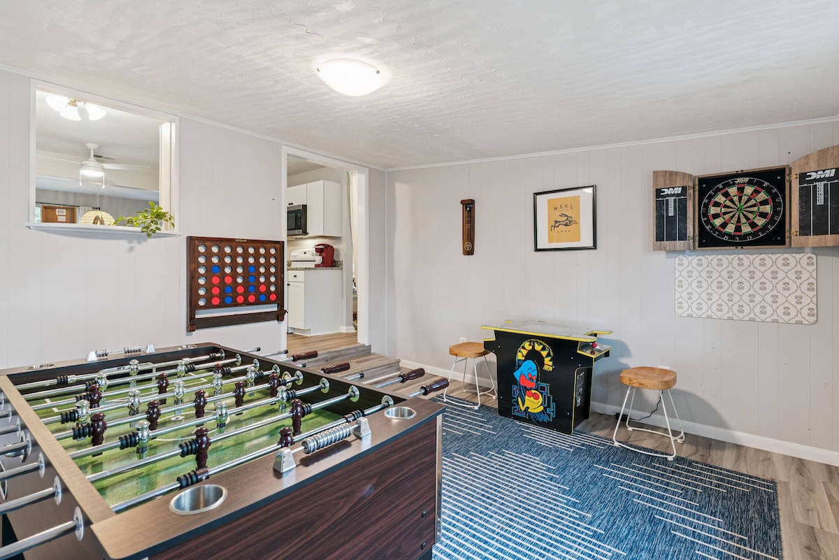 평화로운 가족 분위기를 연출하기 위해 남부 참나무가 늘어선 중심부에 위치한 이 숙소에 머무르면 가족이 모든 것에 가까워질 수 있습니다. 뒷마당의 울타리는 화덕, 숯불 그릴, 온수 욕조, 현관 벽난로, 야외 샤워실, 다양한 마당 게임을 즐길 수 있는 넓은 마당, 반려견과 함께 즐길 수 있는 엔터테인먼트 중심입니다. 또는 베란다에서 좋아하는 음료를 마시며 흔들 의자에서 휴식을 취해보세요.