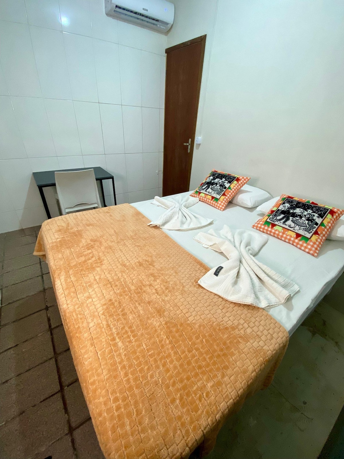 Quarto duplo aconchegante na Pousada dos Artistas, Rua Alfredo Alves Araújo 430, Santa Cruz. Ambiente climatizado, com WiFi e camas confortáveis. Arquitetura simples e charmosa que proporciona acolhimento. Localização estratégica, próxima a restaurantes, comércio e pontos turísticos, com fácil acesso ao centro e ao aeroporto, ideal para casais ou amigos em lazer ou negócios.