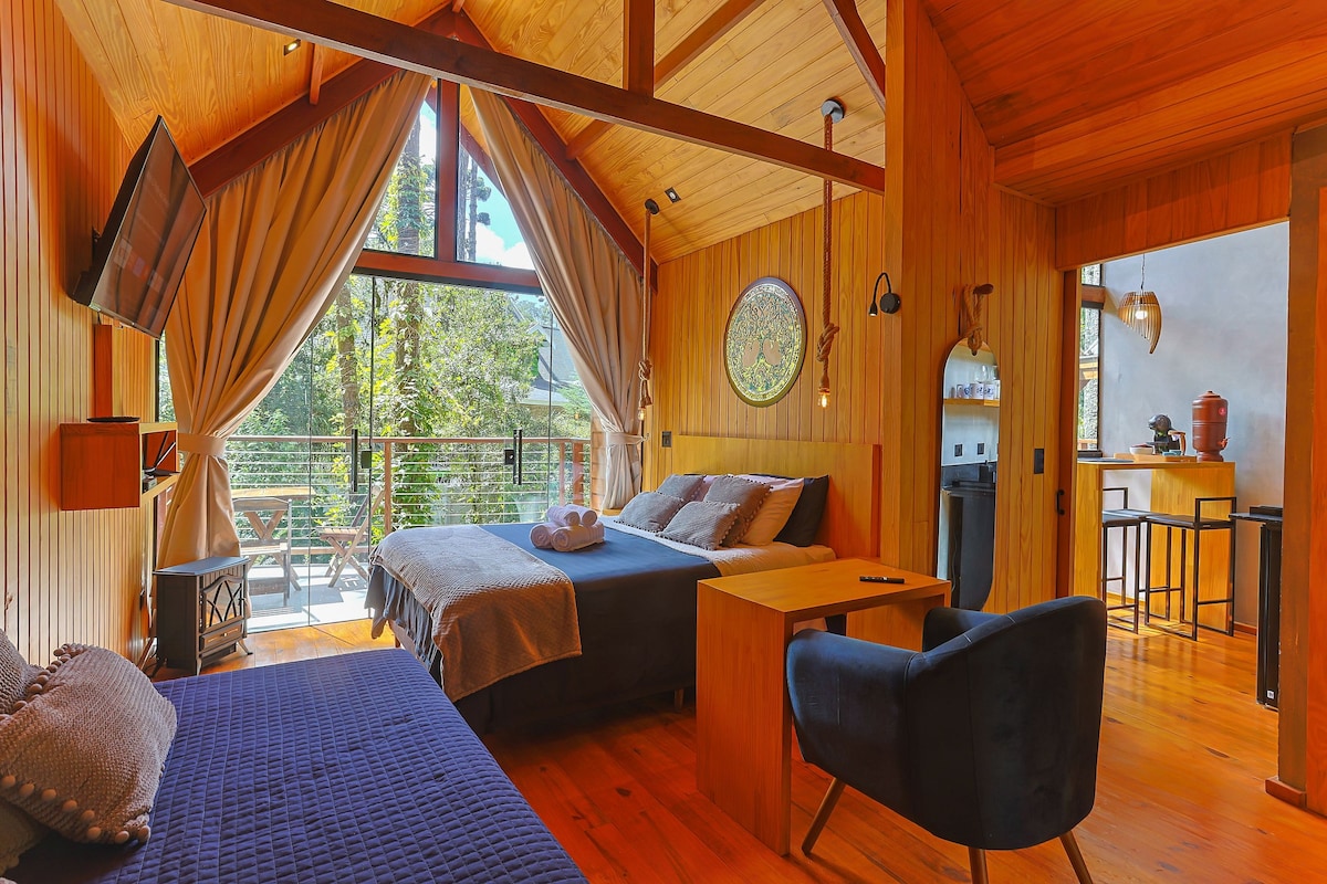 Temos 2 gatinhos, Lord Juba e Shiva que são moradores da casa e são os anfitriões mais fofos e simpáticos do AirBnb. A casa é aconchegante, tem decoração rústica, uma cozinha com fogão a lenha super equipada para quem gosta de cozinhar. Tem muita natureza aos redores, arvores, horta e um gramado delicioso pra curtir um final de tarde. A vista é de tirar o fôlego e a integração com a natureza acontece em todos os cômodos, através das janelas envidraçadas.