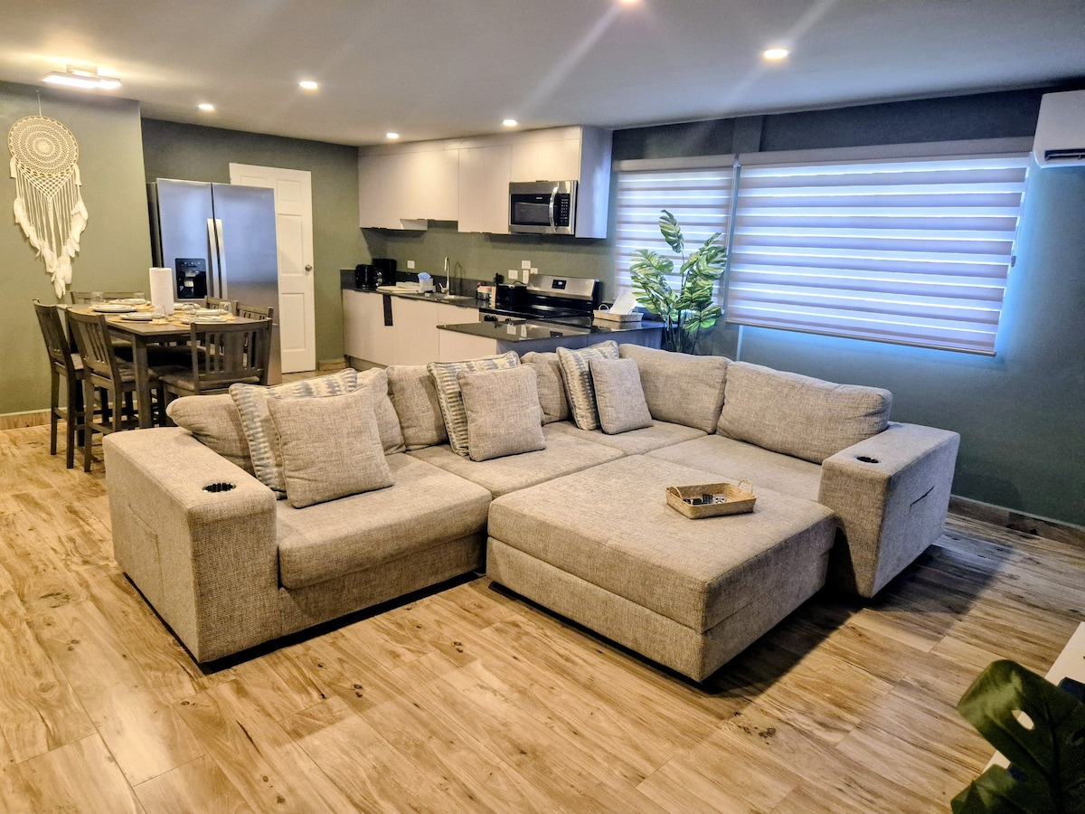 Located in a safe, gated community, Kali'na was created to be a home away from home. Our stylish three-bedroom condo is excellent for families or small groups seeking a modern getaway. Relax in our spacious open-plan living/dining/kitchen space, which has comfy seating and all required kitchen appliances. Enjoy our 65-inch smart TV and fast Wi-Fi ensuring simultaneous connectivity on several devices. Enjoy a shaded terrace with a steady cool Caribbean breeze. 2 shared pools & playground.