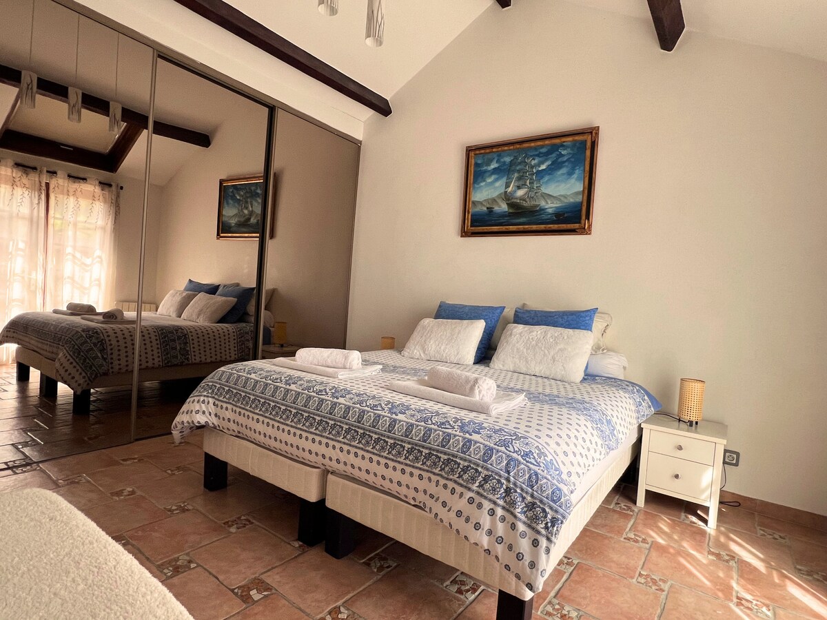 막다른 골목 끝에 있는 32m2 크기의 아파트로 숙소 전용 정원이 있는 집 2층에 위치해 있으며, 울타리로 주 정원과 분리되어 있습니다. - 조식 포함 - 경쟁력 있는 가격과 지역 제품을 판매하는 식료품점은 마을 위쪽에서 도보로 5분 거리에 있습니다(개조된 구 우체국). - 기타 상점: 차로 10분. - 로이시 CDG 공항 14분(비행 통행로 외부 마을). - 셔우드 파크 16분. - 빌팽트 전시 공원 17분 - 아스테릭스 공원 19분. - 부르제 전시 공원 20분. - 샹티이 성 24분. - 라 메르 드 샌드 32분. - 디즈니랜드 파리 42분. - 파리 포르트 드 라 샤펠 ~40분/26km