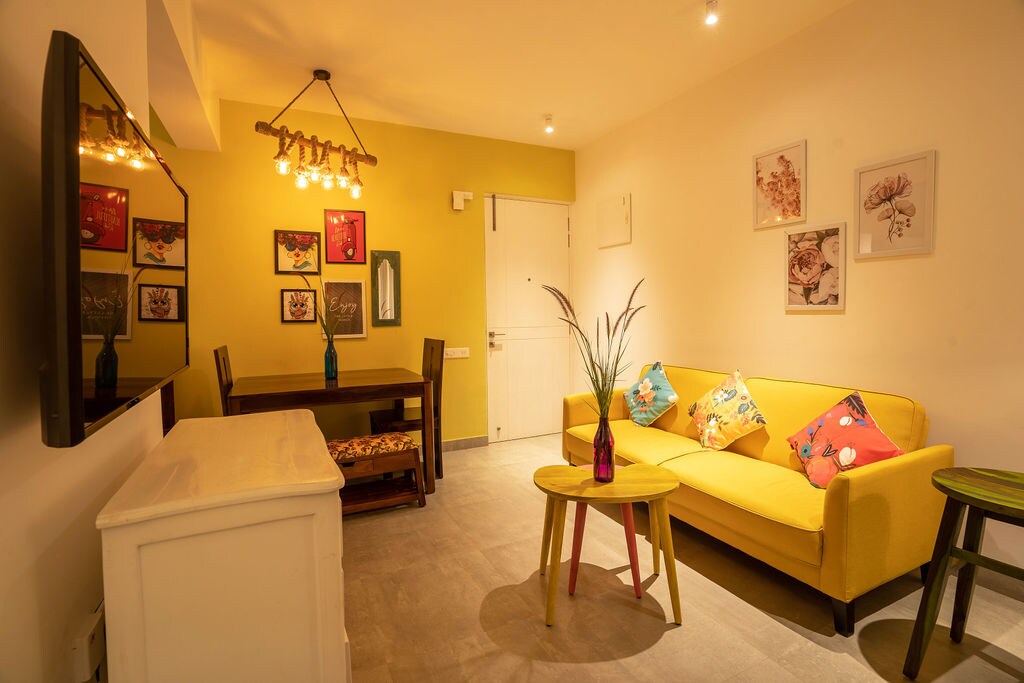 이 독특한 숙소는 독특한 스타일을 자랑합니다. 커플을 위한 온수 욕조와 모든 조리 도구가 있는 주방이 있습니다. 100mbps 임대 라인 광대역 연결 무제한. 24시간 서비스, 🏊 수영장, 헬스장, TT 테이블이 있는 클럽하우스, 24시간 인버터 백업을 위한 5명의 관리인이 있습니다. 퀸사이즈 5 * 6.5평방피트 퀼트가 있는 침실의 침대 바가 칼랑굿 해변, 리프트 2개, 에어컨, 간헐천, 타타 하늘이 있는 TV, 수건, 냉장고, 퀸사이즈 소파 겸 침대, 베개와 퀼트가 있는 추가 게스트 1명