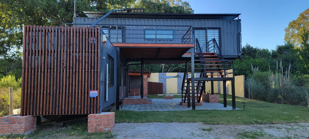 컨테이너 하우스, R. Interbalnearia, Calle H와 가깝고, A. Solis와 가깝고, 해변에서 8블록, Atlantida, Parque del Plata Sur에서 5분, 울타리 있는 땅, 중형에서 소형 차량을 위한 지붕 있는 공간(5x5m). 그릴 4인용, 침실 2개: 더블 침대와 두 번째 침대 1 평방, 두 침실에 에어컨. 와이파이, 케이블 TV 가족과 함께 즐길 수 있는 조용한 환경. 파티에 적합하지 않습니다. 반려동물 동반에 적합하지 않음