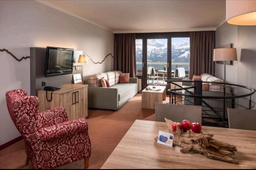 This new chalet is perched above the car free village of MURREN in the Bernese Oberland outside charming Interlaken. The apartment is the lower floor of the chalet with a spacious living/dining room and large windows that look across the spectacular Lauterbrunnen Valley with its 72 waterfalls to the North Face of the Eiger and the Jungfrau Massif. It offers the best view of any chalet rental in Murren. The Master Bedroom has a king bed and 2 walk in closets leading to the bathroom with shower and tub. On the edge of the living room is a queen wall bed, so the apartment comfortably sleeps 4 . The fully equipped modern kitchen has granite counter tops, dishwasher, 4 burner stove and oven. The fridge has a freezer. There is a bar with bar stools. The chalet has a wood burning stove and radiant floor heating. In the winter, guests can walk 8-10 minutes to the Allmendhubelbahn or 2 minutes to the BLM station for a quick train ride to the quad lift at Winteregg. We offer you free ski lockers and boot warmers.. You will love this space in the typical charming Swiss village of Murren. We're adjacent to a wildlife preserve, with occasional sightings of graceful charming Chamois, so we cannot accommodate dogs or cats. If you want spacious, quiet, private, cozy and spectacular, this place is for you. World famous hiking and skiing are at the doorstep. And a Peace you've never before experienced. After you check in, you'll be welcomed by our wonderful Property Manager Liza who will help you fill out the Kurtaxe form. While we pay the Kurtaxe for you, you need the filled out form in order to pick up the "Kurkarte" ID card at the Sports Center. With this card you can enjoy the free indoor swimming pool/hot tub plus free ice-skating in the winter. You can also benefit from discounts at various stores.